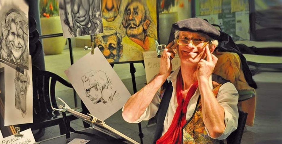 Als französischer Montmartre-Maler zeichnet er spaßig, humorvolle Karikaturen